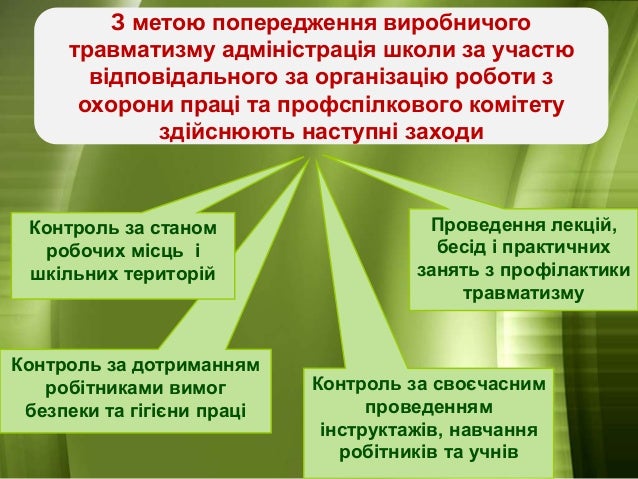 Питання охорони праці все серйозніше звучать сьогодні в організації навчально-виховного процесу. Одна з головних вимог щодо ефективності діяльності закладу – це дотримання встановлених правил і норм з охорони праці. Згідно „Положення про організацію роботи з охорони праці учасників навчально – виховного процесу в установах і закладах освіти» значна увага акцентується на створення безпечних і нешкідливих умов праці та навчання, вживанні конкретних заходів щодо попередження випадків травматизму та збереження життя і здоров’я всіх учасників навчально – виховного процесу.